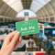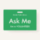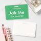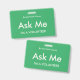 Crachás verdes e brilhantes do tipo "Pergunte-me" para voluntários, professores, centavos, guias, organizadores de eventos para eventos especiais, como casamentos, feiras de artesanatos, shows de casas e jardins, eventos de caridade, funções empresariais e corporativas. A cor da tipografia é marfim pálido que dá a este crachá uma aparência moderna.
