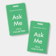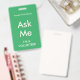 Crachás verdes e brilhantes do tipo "Pergunte-me" para voluntários, professores, centavos, guias, organizadores de eventos para eventos especiais, como casamentos, feiras de artesanatos, shows de casas e jardins, eventos de caridade, funções empresariais e corporativas. A cor da tipografia é marfim pálido que dá a este crachá uma aparência moderna.