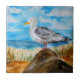 um trabalho de arte de aquarela tradicional com uma pequena gaivota sentada numa rocha em frente a uma praia arenosa e um oceano azul sob um céu nublado.