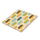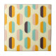 A seamless geometric pattern features vertical, oval shapes in soft yellow, teal, peach, orange, and brown, creating a retro, playful vibe.