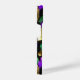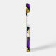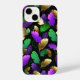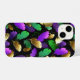 Seamless pattern of bright purple, green, and gold feathers on black Mardi Gras background. Design for the Mardi Gras holiday.