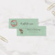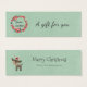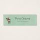 Um cartão de visita magro que você pode usar como etiqueta de presente. Colocado sobre um fundo verde retroativo com textura de linho. Uma bonito coroa de natal criada com aquarelas. Flores vermelhas e folhas verdes em forma circular com Seasons Gretures escritos em uma moda moderna manuscrita. Na parte de trás, uma bela ilustração de veados da floresta vestindo um chapéu vermelho de santa - estilo hipster, com texto personalizado.