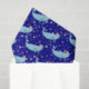 Uma bela ilustração de um narval vestindo um chapéu de Papai Noel contra um fundo azul com flocos de neve.