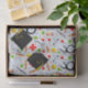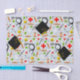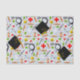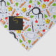 Padrão de design artístico-médico com tema, apresentando suprimentos de saúde, flores e bonés de formatura em fundo azul.