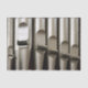 Um fim acima da vista das tubulações de órgão do metal que mostram as bocas das tubulações como descem em tamanho ao longo da fileira. Faria um tecido de envolvimento ideal para todo o organista ou músico da igreja.