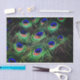 Papel-presente tecidular com imagem de penas de pavão.