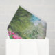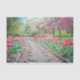 Fotografia no Primavera cenico apresenta um caminho de jardim com lindas tulipas rosa com árvores floridas cor-de-rosa, verdes e brancas, distantes. Perfeito para quebra ou quebra-cabeça de presente