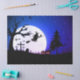 Papel de tecido dotado com imagens de Halloween de uma lua de cheio com bruxa, morcegos, cemitério, aranha e lanternas de jack-0. Em cores azul, preto e branco.
