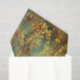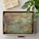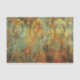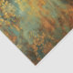 Este é um padrão decorativo ornamentado em tons de ouro, turquesa e ferrugem. O design apresenta um damasco intrincado, simétrico ou arabesco que se assemelha a folhas estilizadas de acanthus, pergaminhos e elementos florais dispostos em colunas verticais. Os padrões têm uma aparência afligida, meteorológica, com áreas desbotadas e vestidas, revelando turquesa e ferrugem por baixo da camada superior de ouro. Este efeito patina envelhecido dá ao design uma sensação antiga ou vintage.