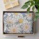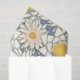 A ilustração das flores brancas e amarelas do lótus é feita em azul-água.