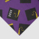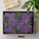 Tecido de formatura criativa de presente e formando com bonés pretos e dourados em fundo roxo. Editar texto para personalizar.