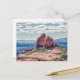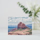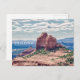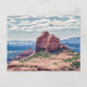Cartão postal com uma fotografia original da paisagem de rochas vermelhas em Sedona, Arizona com fundo azul e roxo.