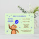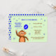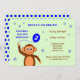 Este convite de festas segundo aniversário tem um macaco sorridente segurando um balão azul de segundo aniversário. "Ajude-nos a celebrar!" Todo o texto é editável, basta digitar os detalhes de sua parte nas caixas de personalização. O fundo do cartão é verde-claro e existem algumas estrelas azuis, verdes e brancas dispersas. No verso, há um padrão de bolinhas azul com uma estrela solteiro no centro.