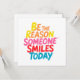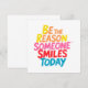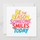 Dê mais atenção ao dia de alguém com este cartão de saudação alegre e eloquente com a inspiradora frase "Seja a razão que alguém sorri hoje" em letras vibrantes e coloridas. Quer você esteja dando a um amigo ou usando-o como um lembrete diário para liderar com bondade, este design transmite uma mensagem de encorajamento, alegria e boas vibrações.