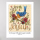 Este pássaro azul pintado à mão contemporâneo senta-se sobre um galho de lindas flores cantando "seja alegre". Abaixo da arte colorida está o verso Bíblia Nehemiah 8:10, escrito à mão... "Porque a alegria do Senhor é a sua força."