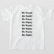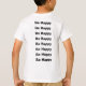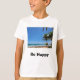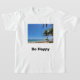 T-shirt com uma fotografia de ilha tropical relaxante e as palavras "Be Happy". O texto é repetido no verso.