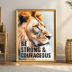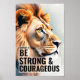 Leão majestoso com uma expressão serena e poderosa, cercado por uma luz ouro brilhante. O fundo é um gradiente suave de tons de terra quente, simbolizando força e fé. Sobrepor a imagem é um verso Bíblia inspirador escrito em letras elegantes, como 'Seja forte e corajoso Joshua 1:9.