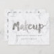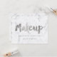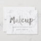 Um moderno, na moda, certificado de presente, cartão de visita de maquiador com estilo moderno de letra de mão, tipografia de pincel em prata em uma moda e elegante fundo de mármore branco. Se precisar de alguma personalização, não hesite em me contactar