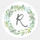 Use este design de aspecto limpo com uma coroa de folha verde de eucalipto e uma letra R de monograma para várias ocasiões — favor bolsas, selos de envelopes, etc.