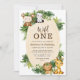 Um convite de aniversário para o tema safari da selva com bebês selvagens e vegetação da selva. As cores e o texto podem ser personalizados.