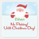 Sem espionagem até que os Papais noeis de Natal deem a etiqueta adesiva. Um presente perfeito para os presentes das crianças neste Natal. Personalize com seus nomes ou deixe o vazio do campo de texto se você preferir nenhum nome especificado. Design apresenta um velho Papai Noel alegre em seu terno e chapéu peludos vermelhos, com bochechas rosadas e uma barba branca grande contra um céu de inverno nevado.