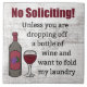 Sem Solicitação! A não ser que você esteja caindo de uma garrafa de vinho e queira dobrar minha roupa. É uma nova reviravolta no sinal comum de "não pedir". Faça luz da situação com este sinal humorístico na sua porta. Quem sabe? Talvez alguém deixe uma garrafa de vinho e dobre sua roupa. Esta design é apresentada sobre um fundo de madeira branca e suja. Obrigado ao comprador que apontou que o azulejo em si não tem um cabide. Para pendurar um azulejo não emoldurado, aplique um gancho D na parte traseira com cola E-6000 ou use uma fita pendurada de imagem de Comando 3M.