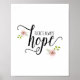 "Há sempre esperança." Mensagem motivacional com caligrafia manuscrita, olhando palavras em preto clássico sobre fundo branco e acentuado com um doce papoila rosa e gráfico de folha. Mistura contemporânea de tipografia lhe dá um tema moderno.
