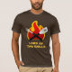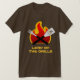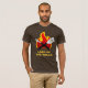 Camisa engraçada customizável com o senhor do logotipo das grades que caracteriza chamas ardentes e ferramentas cruzadas do CHURRASCO em vermelho, em amarelo e em preto.