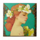Azulejo cerâmico num retrato de uma bela senhora celta de cabelo vermelho, coroada de flores e folhas brancas, enquadrado por uma rede de carpintaria entrelaçada