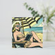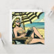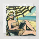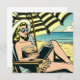 Estilo de banda desenhada de arte pop, preto e amarelo, ai art retratando uma mulher lendo um livro na praia em óculos escuros e vestindo um chapéu de sol debaixo de um guarda-chuva.