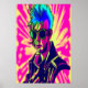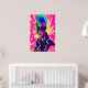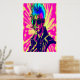 Retrato de uma senhora ciberpunk cabeleira azul num fundo cor de funk. Esta é uma arte gerada por IA.