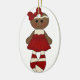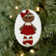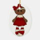 Caracteriza uma menina do pão-de-espécie que veste um vestido e umas meias vermelhos & brancos com um arco em sua cabeça.