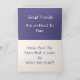 Um cartão de nota impresso em papel de qualidade. Um fundo azul quente na frente com texto" Sentiremos sua falta" Dentro com texto vermelho "Os bons amigos são duros de encontrar" Certifique-se de que a cama sobressalente é feita quando visitarmos"