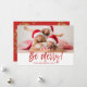 Seja Feliz Cartão com fotos De Manuscrito Com Letra De Natal. A foto e o texto deste script de pincel com letra manual podem ser atualizados e personalizados com sua foto e seu nome de família. Este cartão apresenta também o nome da família e uma coroa de folha de ouro no verso do cartão de Natal.