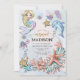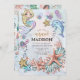 Uma convite de aniversário mágica de sereia debaixo da cena do mar com conchas marinhas, golfinhos, corais, tartarugas e estrelas-do-mar. Bonito aquarela com sereia fofa. Crie um tema mágico para um aniversário da temporada de verão para personalizar para qualquer idade entre 1 e 6 anos ou mais.