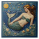 azulejo cerâmico siciliano de verão, pintura à mão italiana, decorativa, sereia mediterrânica portuguesa, design, "mar marinho azul", "sereias míticas mitológicas de conto de fadas", "azul e amarelo coloridos", pintura clássica autêntica e tradicional, rústica primavera antiga vintage, arte popular espanhola talavera mexicana, "fronteira do círculo de ondas verdes"