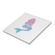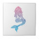 design de uma sereia colorida, apresentando um padrão ornamental em sua silhueta azul e cor-de-rosa, sobre um azulejo cerâmico.