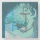 Uma sereia explora ruínas submarinas enquanto segue uma escola de peixes. Uma âncora flutua antes dela como se não tivesse gravidade para afundar. Porta copos de pedra de uma praia náutica fantasiosa.