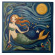 azulejo cerâmico siciliano de verão, pintura à mão italiana, decorativa, sereia mediterrânica portuguesa, design, "mar marinho azul", "sereias míticas mitológicas de conto de fadas", "azul e amarelo coloridos", pintura clássica autêntica e tradicional, rústica primavera antiga vintage, arte popular espanhola talavera mexicana, "fronteira do círculo de ondas verdes"