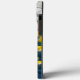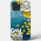 Uma pintura de abstrato, inspirada no ukiyo-e, visualmente marcante, que apresenta uma fina mistura de pétalas de flores brancas e amarelas 3D pintadas no canto superior direito. O fundo azul sereno cria um senso de tranquilidade, enquanto o canto inferior esquerdo apresenta uma capa de telefone, acrescentando um toque de capricho moderno à estética tradicional japonesa.