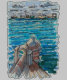 Uma cena costeira serena com uma estrutura de construção em primeiro plano sobre um corpo colorido de água azul, provavelmente um canal ou laguna. Ao fundo, há barcos flutuando na água sob um céu nublado.
