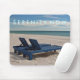 Dois loungechairs azuis vazios na areia branca de Santa Rosa encalham ao longo da costa esmeralda do Golfo do México