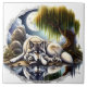 Abaixo de uma lua de cheio luminosa, um lobo majestoso está reposando sob o abrigo de um salgueiro chorão. A cena é perfeitamente espelhada na superfície vívida de um lago tranquilo, convidando um momento de reflexão e paz no abraço da noite.