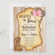O gênero de botas ou arcos revela convite de festas de vaqueiro. Fundo de madeira de aquarela, design de etiqueta de colheita com botas de cowboy e chapéu de feltro.