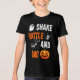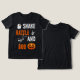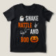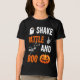 "Shake, Rattle, e Boo", design de camisa do Halloween com um fantasma dançante, esqueleto e abóbora. Esta design captura a vibração festiva e sombria do Halloween, fazer uma maneira divertida de celebrar o feriado de uma forma única. Todos os designs são protegidos por direitos autorais pelo Soar em Designs de Estilo.