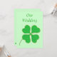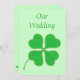 Pintura de um shamrock verde, trevo de quatro folhas, aparado em pontos de ouro, impresso em convites para casamentos. Personalize facilmente o texto nos formulários de modelo.