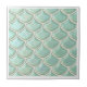 This coastal ceramic tile design features a pattern of stylized fish scales in shiny light mint green tones outlined in ivory white. The flowing, hand-drawn lines create a sense of movement, while the watery textures add depth and a calm, ocean-inspired atmosphere. Perfect for beach-inspired décor themes, it brings a touch of underwater serenity to any room. Note: design may contain generative content