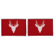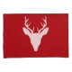 A design original da silhueta branca de Destei de uma cabeça de veado com grandes galhadas numa cor vermelha de fundo.