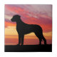 Este por do sol psicadélico original mostra em silhueta um Rhodesian esplêndido Ridgeback no caqui, no linho dourado e no coral. Os sentimentos pessoais podem ser adicionados usando a ferramenta de personalização do texto. Dois tamanhos do azulejo estão disponíveis, e os quadros ou as caixas de madeira da lembrança podem ser pedidos para aumentar seu azulejo. Um presente distintivo para algum amante do cão, ou uma escolha versátil para troféus do clube.