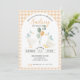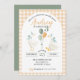 This charming invitation features a whimsical, watercolor design with two cute geese wearing little party hats, set against a stylish tan/orange and white checkered plaid background (or gingham). The design has an arch shape and includes popular colors like sage green, dusty orange, and cream.